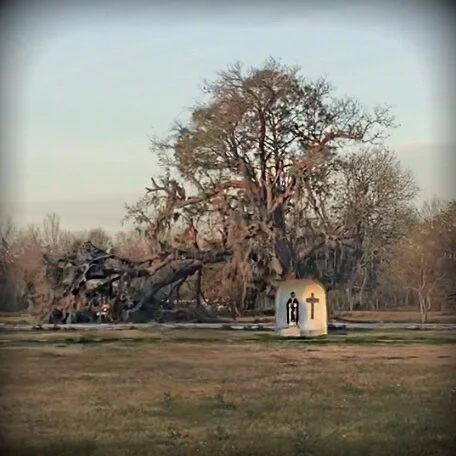 The picture below is in Davant at the site of where the first creole school was, what was left after Katrina came through was the shown statue of Saint Martin de Porres and a cemetery rest behind this unearthed massive tree damage from the hurricane.
